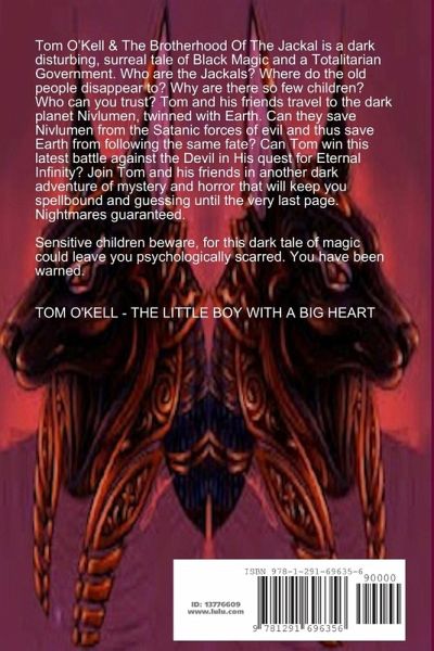 Tom O'Kell & The Brotherhood Of The Jackal is a dark disturbing, surreal tale of Black Magic and a Totalitarian Government. Who are the Jackals? Where do the old people disappear to? Why are there so few children? Who can you trust? Tom and his friends travel to the dark planet Nivlumen, twinned with Earth. Can they save Nivlumen from the Satanic forces of evil and thus save Earth from following the same fate? Can Tom win this latest battle against the Devil in His quest for Eternal Infinity? Join Tom and his friends in another dark adventure of mystery and horror that will keep you spellbound and guessing until the very last page. Nightmares guaranteed. Sensitive children beware, for this dark tale of magic could leave you psychologically scarred. You have been warned.