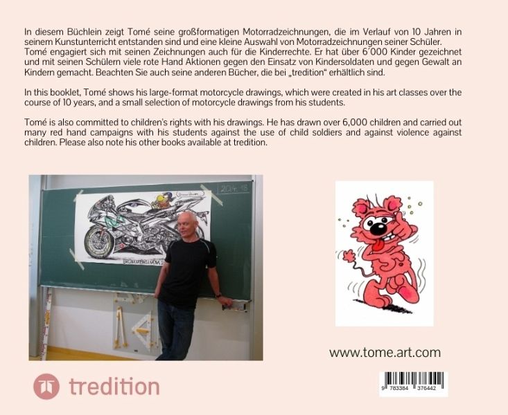 In diesem Büchlein zeigt Tomé seine großformatigen Motorradzeichnungen, die im Verlauf von 10 Jahren in seinem Kunstunterricht entstanden sind und eine kleine Auswahl von Motorradzeichnungen seiner Schüler.In this booklet, Tomé shows his large-format motorcycle drawings, which were created in his art classes over the course of 10 years, and a small selection of motorcycle drawings from his students.