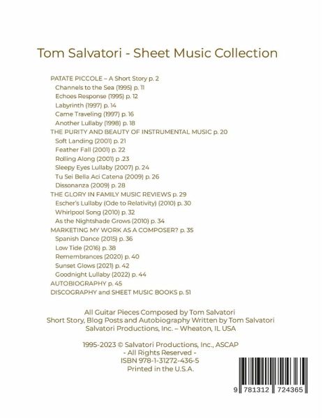 Tom Salvatori: A Lifetime in Music - Sheet Music Collection - Solo Guitar. Tom Salvatori (b.1958) has been quietly composing original instrumentals for the nylon string guitar in his own self-constructed corner of the music world for over fifty years. All told, Salvatori has composed, produced, and recorded 150+ guitar pieces, which have achieved over forty million streams and downloads across the digital service platforms to date. "Tom Salvatori: A Lifetime in Music" (2023), is Salvatori's 3rd Published Sheet Music Book, available directly from Salvatori Productions, Inc. (salvatoriproductions.com). It is a 51-page career retrospective collection that features nineteen previously unpublished solo nylon string guitar pieces composed by Salvatori between 1995 and 2023. The Sheet Music Book also introduces 'Patate Piccole' (Small Potatoes), a short story told in parable form that reflects on Salvatori's upcoming retirement as he looks forward to the pleasant experience of sharing his guitar compositions with the next generation of guitarists. Salvatori received a press review early in his composing career that described his work as being "...of the small potato variety." Instead of feeling slighted, he embraced the style description and adopted it as a new nickname. It is likely that that comment stuck in his craw as unfinished business because decades later, 'Patate Piccole' came pouring out of him...in just a couple hours! In addition, "Tom Salvatori: A Lifetime in Music" features an accompanying CD, blog posts, press reviews and a brief scrapbook-styled Autobiography (including pictures) that summarize Salvatori's lifetime in music and his unique composing perspective for the nylon string guitar. "Tom Salvatori: A Lifetime in Music" (2023) (c) Salvatori Productions, Inc. - 51 Pages - ISBN 978-1-312-72436-5 - Printed in the U.S.A. Two previously released Tom Salvatori Sheet Music Books are available from world-renowned classical guitar publisher Les Productions d'Oz (productionsdoz.com) in Canada. They are: - "Tom Salvatori: Late Night" (2004) is a collection of Sheet Music drawn from 1995-2001. It features eleven Salvatori guitar solos along with an accompanying CD. - "Tom Salvatori: A Year in the Life" (2022) is Sheet Music drawn from Salvatori's celebrated 2013 album release of the same name. It features all thirteen guitar solos from the album.
