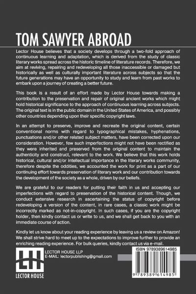 Tom Sawyer Abroad This book is a result of an effort made by us towards making a contribution to the preservation and repair of original classic literature. In an attempt to preserve, improve and recreate the original content, we have worked towards: 1. Type-setting & Reformatting: The complete work has been re-designed via professional layout, formatting and type-setting tools to re-create the same edition with rich typography, graphics, high quality images, and table elements, giving our readers the feel of holding a 'fresh and newly' reprinted and/or revised edition, as opposed to other scanned & printed (Optical Character Recognition - OCR) reproductions. 2. Correction of imperfections: As the work was re-created from the scratch, therefore, it was vetted to rectify certain conventional norms with regard to typographical mistakes, hyphenations, punctuations, blurred images, missing content/pages, and/or other related subject matters, upon our consideration. Every attempt was made to rectify the imperfections related to omitted constructs in the original edition via other references. However, a few of such imperfections which could not be rectified due to intentional\unintentional omission of content in the original edition, were inherited and preserved from the original work to maintain the authenticity and construct, relevant to the work. We believe that this work holds historical, cultural and/or intellectual importance in the literary works community, therefore despite the oddities, we accounted the work for print as a part of our continuing effort towards preservation of literary work and our contribution towards the development of the society as a whole, driven by our beliefs. We are grateful to our readers for putting their faith in us and accepting our imperfections with regard to preservation of the historical content. HAPPY READING!
