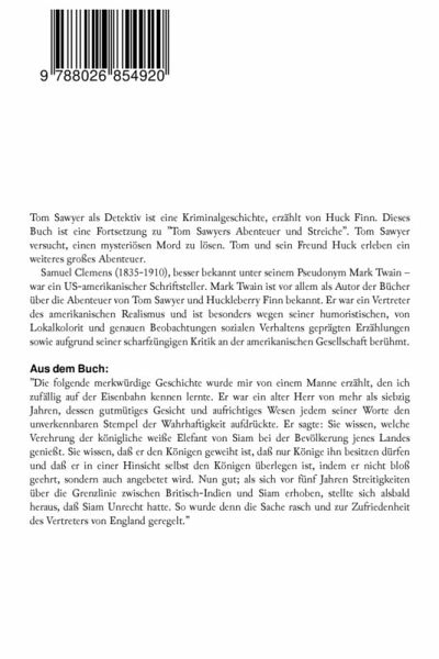 Tom Sawyer als Detektiv ist eine Kriminalgeschichte, erzählt von Huck Finn. Dieses Buch ist eine Fortsetzung zu "Tom Sawyers Abenteuer und Streiche". Tom Sawyer versucht, einen mysteriösen Mord zu lösen. Tom und sein Freund Huck erleben ein weiteres großes Abenteuer. Samuel Clemens (1835-1910), besser bekannt unter seinem Pseudonym Mark Twain - war ein US-amerikanischer Schriftsteller. Mark Twain ist vor allem als Autor der Bücher über die Abenteuer von Tom Sawyer und Huckleberry Finn bekannt. Er war ein Vertreter des amerikanischen Realismus und ist besonders wegen seiner humoristischen, von Lokalkolorit und genauen Beobachtungen sozialen Verhaltens geprägten Erzählungen sowie aufgrund seiner scharfzüngigen Kritik an der amerikanischen Gesellschaft berühmt. Aus dem Buch: "Die folgende merkwürdige Geschichte wurde mir von einem Manne erzählt, den ich zufällig auf der Eisenbahn kennen lernte. Er war ein alter Herr von mehr als siebzig Jahren, dessen gutmütiges Gesicht und aufrichtiges Wesen jedem seiner Worte den unverkennbaren Stempel der Wahrhaftigkeit aufdrückte. Er sagte: Sie wissen, welche Verehrung der königliche weiße Elefant von Siam bei der Bevölkerung jenes Landes genießt. Sie wissen, daß er den Königen geweiht ist, daß nur Könige ihn besitzen dürfen und daß er in einer Hinsicht selbst den Königen überlegen ist, indem er nicht bloß geehrt, sondern auch angebetet wird. Nun gut; als sich vor fünf Jahren Streitigkeiten über die Grenzlinie zwischen Britisch-Indien und Siam erhoben, stellte sich alsbald heraus, daß Siam Unrecht hatte. So wurde denn die Sache rasch und zur Zufriedenheit des Vertreters von England geregelt."