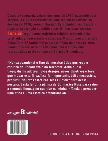 Encontros (Meetings) is the largest and most prestigious book collection of interviews with Brazilian artists and thinkers. With more than 50 published titles, Encontros provides a broad panorama of Brazil's cultural and intellectual wealth. From the avant-garde of Bahia in the 1960s, through Tropicália and the radical experimentalism of the records of the 1970s, such as the classic "Estudando o Samba", to the recovery of public attention in the last three decades, Tom Zé has followed an original path, marked by creativity, irreverence, and courage. More than a unique artist, Tom Zé is also a unique thinker of our culture, as can be seen in the statements and interviews reproduced in this volume of Coleção Encontros.