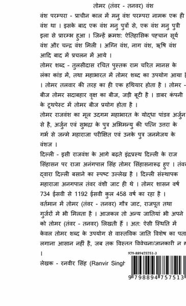 Tomar (Tanwar) dynasty - Dynasty -Tradition - In ancient times there was only one dynasty called Manu Vansh Parampara. After this a dynasty started from Manu sons, another dynasty started from Manu daughter Ila. Who respectively got the historical identity Surya dynasty and Chandra dynasty. Agni dynasty, Nag dynasty, Rishi dynasty etc. came into vogue later. The word Tomar - The use of the word Tomar has come in the book Ram Charit Manas written by Tulsidas in the Lanka Kand, and in the Mahabharata. Tomar is a weapon similar to a sword. Tomar is the seed, herb of the evergreen tree and used in the toothpaste of Dabur Company. The origin of the Tomar dynasty is from the Pandava Arjuna, the warrior of the Mahabharata, the descendants of Maharaja Parikshit and his son Janmejaya, born from the womb of Uttara, wife of Abhimanyu, son of Arjuna and Subhadra, brother and brother-in-law of Lord Krishna. Delhi - King Anangpal Singh Tomar ascended the throne of Indraprastha Delhi, moving ahead of this dynasty. There is a clear mention of the Tanwars settling in Delhi. The founder of Delhi was Maharaja Anagpal Tanwar Vanshi Jat. Tomar's rule was from 734 AD to 1192 AD a total of 458 years. At present Tomar (Tanwar) Gautra is also found in Jats Rajputs and Gujjars. Nowadays other castes also write themselves as Tomar (Tanwar). in such a situation, it is not easy to find out the actual caste by using the word Tomar only unless there is a detailed discussion / information.