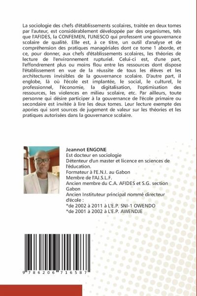 La sociologie des chefs d'établissements scolaires, traitée en deux tomes par l'auteur, est considérablement développée par des organismes, tels que l'AFIDES, la CONFEMEN, l'UNESCO qui professent une gouvernance scolaire de qualité. Elle est, à ce titre, un outil d'analyse et de compréhension des pratiques managériales dont ce tome 1 aborde, et ce, pour donner, aux chefs d'établissements scolaires, les théories de lecture de l'environnement rupturiel. Celui-ci est, d'une part, l'effondrement plus ou moins flou entre les ressources dont dispose l'établissement en vue de la réussite de tous les élèves et les architectures invisibles de la gouvernance scolaire. D'autre part, il englobe, là où l'école est implantée, le social, le culturel, le professionnel, l'économie, la digitalisation, l'optimisation des ressources, les violences en milieu scolaire, etc. Par ailleurs, toute personne qui désire participer à la gouvernance de l'école primaire ou secondaire est invitée à lire les deux tomes. Leur lecture exempte des apories qui sont sources de jugement de valeur sur les théories et les pratiques autorisées dans la gouvernance scolaire.