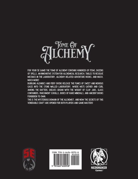Tome of Alchemy For your 5e game! The Tome of Alchemy contains hundreds of items, dozens of spells, an innovative system for alchemical research, tables to resolve mistakes in the laboratory, alchemy-related adventure hooks, and much, much more! Bubbling alembics and fiery ovens release the fumes of sweet and noxious gases into the stone-walled laboratory, where mists gather and curl among the rafters. Shelves groan with the weight of clay jars, glass containers, parchment scrolls, boxes of rare minerals, and ancient books forbidden to own. This is the mysterious domain of the alchemist, and now the secrets of this venerable craft are opened for both players and game masters!