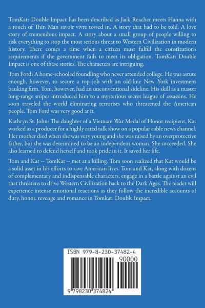 TomKat: Double Impact has been described as Jack Reacher meets Hanna with a touch of Thin Man savoir vivre tossed in. A story that had to be told. A love story of tremendous impact. A story about a small group of people willing to risk everything to stop the most serious threat to Western Civilization in modern history. There comes a time when a citizen must fulfill the constitution's requirements if the government fails to meet its obligation. TomKat: Double Impact is one of these stories. The characters are intriguing. Tom Ford: A home-schooled foundling who never attended college. He was astute enough, however, to secure a top job with an old-line New York investment banking firm. Tom, however, had an unconventional sideline. His skill as a master long-range sniper introduced him to a mysterious secret league of assassins. He soon traveled the world eliminating terrorists who threatened the American people. Tom Ford was very good at it. Kathryn St. John: The daughter of a Vietnam War Medal of Honor recipient, Kat worked as a producer for a highly rated talk show on a popular cable news channel. Her mother died when she was very young and she was raised by an overprotective father, but she was determined to be an independent woman. She succeeded. She also learned to defend herself and took pride in it. It saved her life. Tom and Kat -- TomKat -- met at a killing. Tom soon realized that Kat would be a solid asset in his efforts to save American lives. Tom and Kat, along with dozens of complementary and indispensable characters, engage in a battle against an evil that threatens to drive Western Civilization back to the Dark Ages. The reader will experience intense emotional reactions as they follow the incredible accounts of duty, honor, revenge and romance in Tomkat: Double Impact.