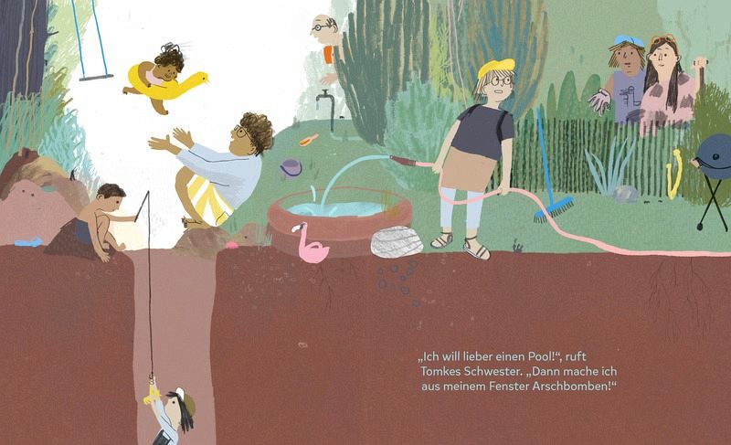 In dem von Julia Dürr illustrierten Buch „Tomke gräbt“, im Mixtvision Verlag erschienen, erzählt die Autorin Lena Hach von der Vertiefung ins Tun. Das, was viele Erwachsene längst verlernt haben, ist in dem Bilderbuch Thema. Ein Kind gräbt mit seiner Schaufel schlicht ein Loch im Garten. Hier trifft es glücklicherweise auf Erwachsene, die nicht sofort dieses Graben verbieten, aber die Menschen in seiner Umgebung stellen Vermutungen darüber an, was das zu bedeuten hat. Es muss doch alles einen Sinn und Zweck haben! Dazu gibt es allerdings keine Antworten. Denn „wer gräbt, kann nicht antworten“, ist im Buch zu lesen.