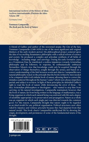 A friend of Galileo and author of the renowned utopia The City of the Sun, Tommaso Campanella (Stilo, Calabria,1568- Paris, 1639) is one of the most significant and original thinkers of the early modern period. His philosophical project centred upon the idea of reconciling Renaissance philosophy with a radical reform of science and society. He produced a complex and articulate synthesis of all fields of knowledge - including magic and astrology. During his early formative years as a Dominican friar, he manifested a restless impatience towards Aristotelian philosophy and its followers. As a reaction, he enthusiastically embraced Bernardino Telesio's view that knowledge could only be acquired through the observation of things themselves, investigated through the senses and based on a correct understanding of the link between words and objects. Campanella's new natural philosophy rested on the principle that the books written by men needed to be compared with God's infinite bookof nature, allowing them to correct the mistakes scattered throughout the human 'copies' which were always imperfect, partial and liable to revisions. It is in the light of these principles that he defended Galileo's right to read the book of nature while denouncing the mistake of those - be they Aristotelian philosophers or theologians - who wanted to stop him from carrying on his natural investigations. However, Campanella maintained that the book of nature, far from being written in mathematical characters, was a living organism in which each natural being was endowed with life and a degree of sensibility that was appropriate for its preservation and propagation. Nature as a whole was an organism in which each single part was directed towards the common good. This is the reason why Campanella thought that nature had to be regarded as an ideal model for any political organisation. Political structures were often ruled by injustice and violence precisely because they haddepartedfrom that natural model. This book charts Campanella's intellectual life by showing the origin, development and persistence of some of the fundamental tenets of his thought.