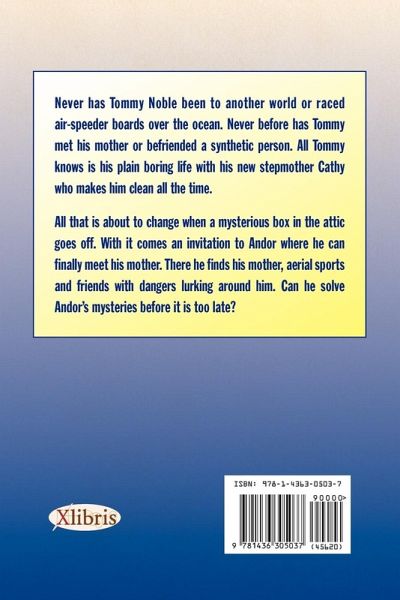 Never has Tommy Noble been to another world or raced air-speeder boards over the ocean. Never before has Tommy met his mother or befriended a synthetic person. All Tommy knows is his plain boring life with his new stepmother Cathy who makes him clean all the time. All that is about to change when a mysterious box in the attic goes off. With it comes an invitation to Andor where he can finally meet his mother. Once there he finds his mother,aerial sports and friends with dangers lurking all around him. Can he solve Andor¿s mysteries before it is too late? For children 9-16 years old.