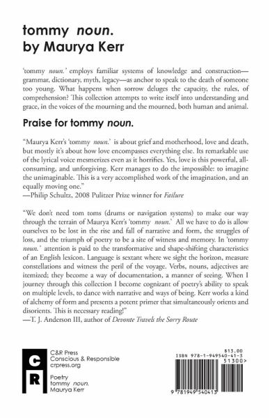 "tommy noun." employs familiar systems of knowledge and construction-grammar, dictionary, myth, legacy-as anchor to speak to the death of someone too young. What happens when sorrow deluges the capacity, the rules, of comprehension? This collection attempts to write itself into understanding and grace, in the voices of the mourning and the mourned, both human and animal.