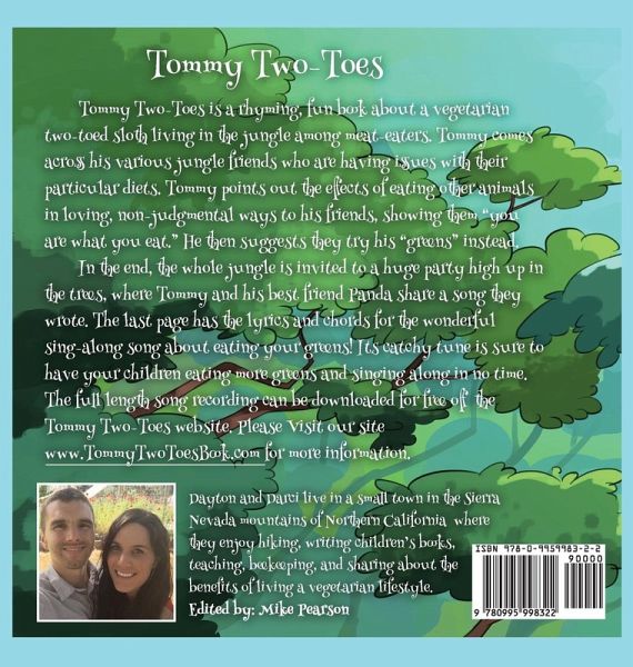 Tommy Two-Toes is a rhyming, fun book about a vegetarian two-toed sloth living in the jungle among meat-eaters. Tommy comes across his various jungle friends who are having issues with their particular diets. Tommy points out the effects of eating other animals in loving, non-judgmental ways to his friends, showing them "you are what you eat". He then suggests they try his "greens" instead. In the end, the whole jungle is invited to a huge party high up in the trees, where Tommy and his best friend Panda share a song they wrote. The last page of the book has the lyrics and chords for the wonderful sing-along song about eating your greens! It's catchy tune is sure to have readers eating their greens and singing along in no time. The full length song recording can be downloaded for free from the Tommy Two-Toes website at www.tommytwotoesbook.com A percentage of the proceeds from this book will be donated to an animal rescue charity.