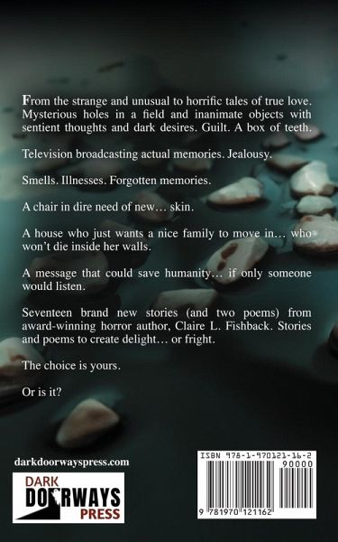 From the strange and unusual to horrific tales of true love. Mysterious holes in a field and inanimate objects with sentient thoughts and dark desires. Guilt. A box of teeth. Television broadcasting actual memories. Jealousy. Smells. Illnesses. Forgotten memories. A chair in dire need of new... skin. A house who just wants a nice family to move in... who won't die inside her walls. A message that could save humanity... if only someone would listen. Seventeen brand new stories (and two poems) from award-winning horror author, Claire L. Fishback. Stories and poems to create delight... or fright. The choice is yours. Or is it?