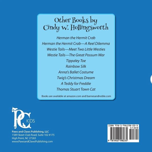 Ms. Hollingsworth began dance training at the age of three. Her first month of dancing was spent on the teacher's lap crying for her mother. But once her feet-in tiny pink ballet shoes-hit the floor, it was love at first dance. And that love has continued to this day some 70 years later. Though years have taken much from her dance agility, she still enjoys her creative and technical knowledge and uses them to continue to teach and choreograph for students in surrounding local dance studios. Her life has been one of devotion to the dance arts and choreography and studying them all through her high school and college years. She graduated with a degree in Dance as Performing Arts from the University of North Carolina at Greensboro. During her sophomore year in college, she met and fell in love with her husband of 43 years, Ray Hollingsworth. Together they built two of the largest and best-known dance education centers in North Carolina and Virginia, and a Dance Seminar and Competition Company known as Dance Troupe, Inc. (DTI). "My life has always been about dance and creating. Sometimes the creation leads to paths other than dance such as songwriting and writing in general, and that has been a wonderful gift. Music, theater, and the performing arts stir my soul to the highest heights of energy and enthusiasm and make living in the arts a dream come true. "I'm delighted that through the Paws and Claws Publishing company, I have been accepted into a community of artists who write and portray their thoughts and stories through words. I'm so excited to be writing for the younger generation, the very small child. I have found a wonderful partnership with Jennifer Cappoen, my illustrator, and Lynn Bemer Coble, my editor. They've helped bring my previous books to reality. I am most thankful to God for giving me the stories and ideas that seemingly pop into my head and then flow onto the paper into the stories that will be developed and enhanced by the Paws and Claws team. "I am also extremely excited to be able to say I'm an award-winning author. Who gets to say that? Me. I can't believe it. But thank you to my Paws and Claws team for making it possible. In December of 2016 I was selected by the Dog Writers Association of America to be in a group of five finalists for the Best Children's Book. In February 2017 I was chosen as the winner of the Maxwell Medallion and given the honor of having Westie Tails-Meet Two Little Westies chosen as the best Children's Book of 2016 by this association. Thank you, thank you so much. We don't get to any one place or honor in this life without the help of others. This is definitely true for this award. "I'll have more books to come in the future. I'll continue to write as stories are given to me. I am so thankful that 'my little books' have been well received by my surrounding community and by others not only here in the United States but also across the seas. "Life is truly about accepting and being open to new horizons, hoping to succeed but also open to the fact that failing only gives you one more advantage in the direction in which you're being led. Below is my favorite quote from Shakespeare. Thanks, William. You hit the nail on the head. 'All the world's a stage, And all the men and women merely players: They have their exits and their entrances; And one man in his time plays many parts, His acts being seven ages....' "