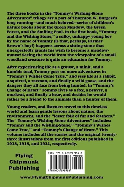 The three books in the ¿Tommy¿s Wishing-Stone Adventures¿ trilogy are a part of Thornton W. Burgess¿s long running ¿ and much beloved ¿ series of children¿s nature books about the Green Meadow, the Green Forest, and the Smiling Pool. In the first book, ¿