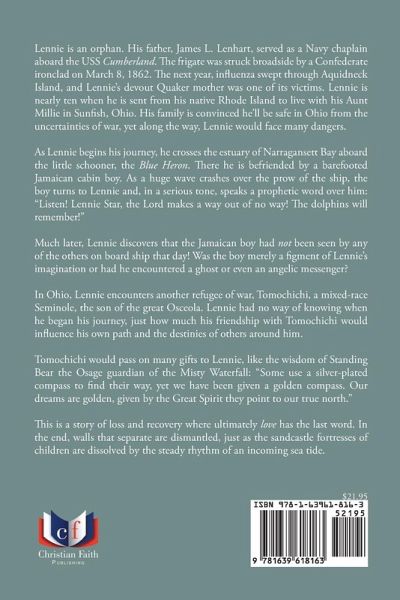 Lennie is an orphan. His father, James L. Lenhart, served as a Navy chaplain aboard the USS Cumberland. The frigate was struck broadside by a Confederate ironclad on March 8, 1862. The next year, influenza swept through Aquidneck Island, and Lennie's devout Quaker mother was one of its victims. Lennie is nearly ten when he is sent from his native Rhode Island to live with his Aunt Millie in Sunfish, Ohio. His family is convinced he'll be safe in Ohio from the uncertainties of war, yet along the way, Lennie would face many dangers. As Lennie begins his journey, he crosses the estuary of Narragansett Bay aboard the little schooner, the Blue Heron. There he is befriended by a barefooted Jamaican cabin boy. As a huge wave crashes over the prow of the ship, the boy turns to Lennie and, in a serious tone, speaks a prophetic word over him: "Listen! Lennie Star, the Lord makes a way out of no way! The dolphins will remember!" Much later, Lennie discovers that the Jamaican boy had not been seen by any of the others on board ship that day! Was the boy merely a figment of Lennie's imagination or had he encountered a ghost or even an angelic messenger? In Ohio, Lennie encounters another refugee of war, Tomochichi, a mixed-race Seminole, the son of the great Osceola. Lennie had no way of knowing when he began his journey, just how much his friendship with Tomochichi would influence his own path and the destinies of others around him. Tomochichi would pass on many gifts to Lennie, like the wisdom of Standing Bear the Osage guardian of the Misty Waterfall: "Some use a silver-plated compass to find their way, yet we have been given a golden compass. Our dreams are golden, given by the Great Spirit they point to our true north." This is a story of loss and recovery where ultimately love has the last word. In the end, walls that separate are dismantled, just as the sandcastle fortresses of children are dissolved by the steady rhythm of an incoming sea tide.