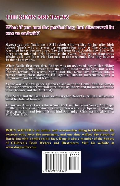 What would you do for the perfect boy? Sixteen-year-old Nadia has an MIT scholarship waiting for her after high school. That's why a mysterious organization know as The Authority recruited her to become a spy. The girl from Saudi Arabia now lives with three other talented girls known as the Gems. They go on dangerous missions all over the world. But first, they must do their homework. When Nadia first met him, Robert was an awkward boy with striking green eyes, hardly someone on the FBI's most wanted list. But when Robert reveals his secret, Nadia and the Gems are thrown into a cross-country chase dodging FBI agents, Russian mercenaries, and a Polynesian giant named Kawiki. As the world's intelligence agencies close in on the Gems, Nadia is forced to choose between her warming feelings for Robert and the oath she swore to her friends and the Authority. Can Nadia and the Gems find sanctuary for Robert or will his self-aware mind be deleted forever? Tomorrow Always Lies is the second book in The Gems Young Adult spy thriller series that features strong characters, girl-power bonding, riveting action, and lots of fun. Think Gallagher Girls sprinkled with some Star Trek.