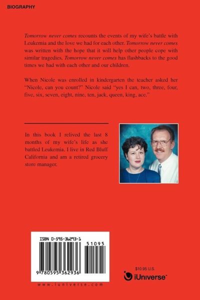 Tomorrow never comes recounts the events of my wife's battle with Leukemia and the love we had for each other. Tomorrow never comes was written with the hope that it will help other people cope with similar tragedies. Tomorrow never comes has flashbacks to the good times we had with each other and our children. When Nicole was enrolled in kindergarten the teacher asked her 'Nicole, can you count?" Nicole said 'yes I can, two, three, four, five, six, seven, eight, nine, ten, jack, queen, king, ace."