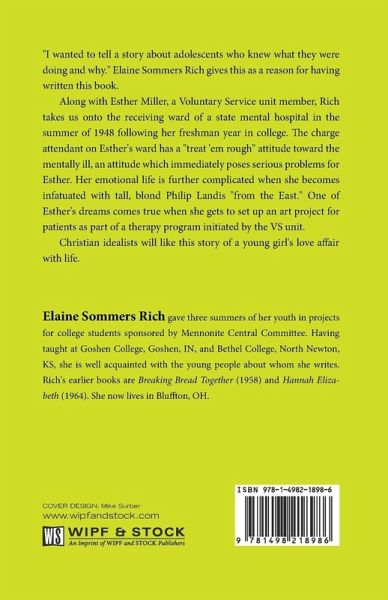 ""I wanted to tell a story about adolescents who knew what they were doing and why."" Elaine Sommers Rich gives this as a reason for having written this book. Along with Esther Miller, a Voluntary Service unit member, Rich takes us onto the receiving ward of a state mental hospital in the summer of 1948 following her freshman year in college. The charge attendant on Esther's ward has a ""treat 'em rough"" attitude toward the mentally ill, an attitude which immediately poses serious problems for Esther. Her emotional life is further complicated when she becomes infatuated with tall, blond Philip Landis ""from the East."" One of Esther's dreams comes true when she gets to set up an art project for patients as part of a therapy program initiated by the VS unit. Christian idealists will like this story of a young girl's love affair with life.