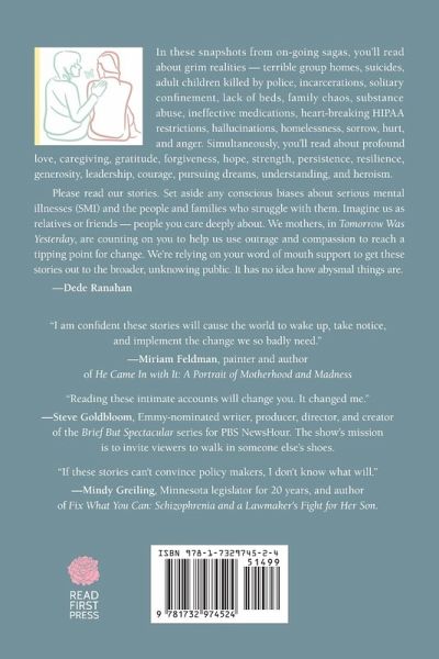 In these snapshots from on-going sagas, you'll read about grim realities - terrible group homes, suicides, adult children killed by police, incarcerations, solitary confinement, lack of beds, family chaos, substance abuse, ineffective medications, heart-breaking HIPAA restrictions, hallucinations, homelessness, sorrow, hurt, and anger. Simultaneously, you'll read about profound love, caregiving, gratitude, forgiveness, hope, strength, persistence, resilience, generosity, leadership, courage, pursuing dreams, understanding, and heroism. Please read our stories. Set aside any conscious biases about serious mental illnesses (SMI) and the people and families who struggle with them. Imagine us as relatives or friends - people you care deeply about. We mothers, in Tomorrow Was Yesterday, are counting on you to help us use outrage and compassion to reach a tipping point for change. We're relying on your word of mouth support to get these stories out to the broader, unknowing public. It has no idea how abysmal things are. -Dede Ranahan "I am confident these stories will cause the world to wake up, take notice, and implement the change we so badly need." -Miriam Feldman, painter and author of He Came In with It: A Portrait of Motherhood and Madness "Reading these intimate accounts will change you. It changed me." -Steve Goldbloom, Emmy-nominated writer, producer, director, and creator of the Brief But Spectacular series for PBS NEWsHour. The show's mission is to invite viewers to walk in someone else's shoes. "If these stories can't convince policy makers, I don't know what will." -Mindy Greiling, Minnesota legislator for 20 years, and author of Fix What You Can: Schizophrenia and a Lawmaker's Fight for Her Son