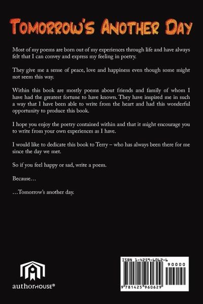 Most of my poems are born out of my experiences through life and have always felt that I can convey and express my feeling in poetry. They give me a sense of peace, love and happiness even though some might not seem this way. Within this book are mostly poems about friends and family of whom I have had the greatest fortune to have known. They have inspired me in such a way that I have been able to write from the heart and had this wonderful opportunity to produce this book. I hope you enjoy the poetry contained within and that it might encourage you to write from your own experiences as I have. I would like to dedicate this book to Terry - who has always been there for me since the day we met. So if you feel happy or sad, write a poem. Because. .Tomorrow's another day.