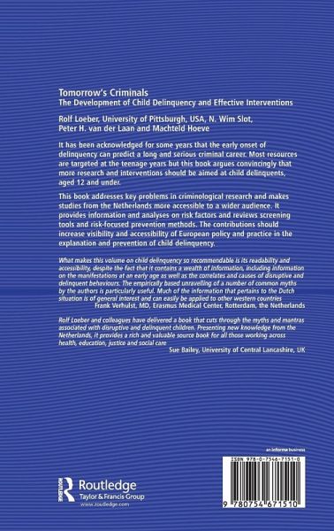 It has been acknowledged for some years that the early onset of delinquency can predict a long and serious criminal career. Most resources are targeted at the teenage years but this book argues convincingly that more research and interventions should be aimed at child delinquents aged 12 and under. Tomorrow's Criminals addresses key problems in criminological research and makes studies from the Netherlands more accessible to a wider audience. It provides information and analyses on risk factors and reviews screening tools and risk-focused prevention methods. The contributions increase visibility and accessibility of European policy and practice in the explanation and prevention of child delinquency.
