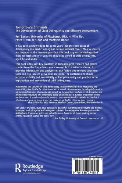 Tomorrow's Criminals argues convincingly that more research and interventions should be aimed at child delinquents aged 12 and under. It addresses key problems in criminological research and makes studies from the Netherlands more accessible to a wider audience. It provides information and analyses on risk factors and reviews screening tools and risk-focused prevention methods. The contributions increase visibility and accessibility of European policy and practice in the explanation and prevention of child delinquency.