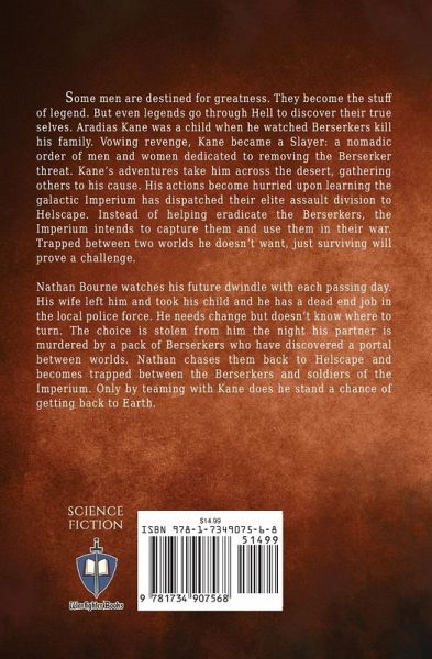 Some men are destined for greatness. They become the stuff of legend. But even legends go through Hell to discover their true selves. Aradias Kane was a child when he watched Berserkers kill his family. Vowing revenge, Kane became a Slayer: a nomadic order of men and women dedicated to removing the Berserker threat. Kane's adventures take him across the desert, gathering others to his cause. His actions become hurried upon learning the galactic Imperium has dispatched their elite assault division to Helscape. Instead of helping eradicate the Berserkers, the Imperium intends to capture them and use them in their war. Trapped between two worlds he doesn't want, just surviving will prove a challenge. Nathan Bourne watches his future dwindle with each passing day. His wife left him and took his child and he has a dead end job in the local police force. He needs change but doesn't know where to turn. The choice is stolen from him the night his partner is murdered by a pack of Berserkers who have discovered a portal between worlds. Nathan chases them back to Helscape and becomes trapped between the Berserkers and soldiers of the Imperium. Only by teaming with Kane does he stand a chance of getting back to Earth.
