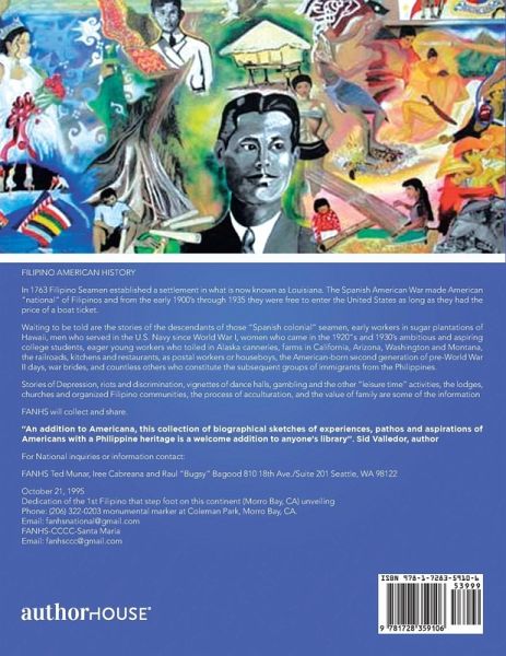 FILIPINO AMERICAN HISTORY In 1763 Filipino Seamen established a settlement in what is now known as Louisiana. The Spanish American War made American "national" of Filipinos and from the early 1900's through 1935 they were free to enter the United States as long as they had the price of a boat ticket. Waiting to be told are the stories of the descendants of those "Spanish colonial" seamen, early workers in sugar plantations of Hawaii, men who served in the U.S. Navy since World War I, women who came in the 1920"s and 1930's ambitious and aspiring college students, eager young workers who toiled in Alaska canneries, farms in California, Arizona, Washington and Montana, the railroads, kitchens and restaurants, as postal workers or houseboys, the American-born second generation of pre-World War II days, war brides, and countless others who constitute the subsequent groups of immigrants from the Philippines. Stories of Depression, riots and discrimination, vignettes of dance halls, gambling and the other "leisure time" activities, the lodges, churches and organized Filipino communities, the process of acculturation, and the value of family are some of the information