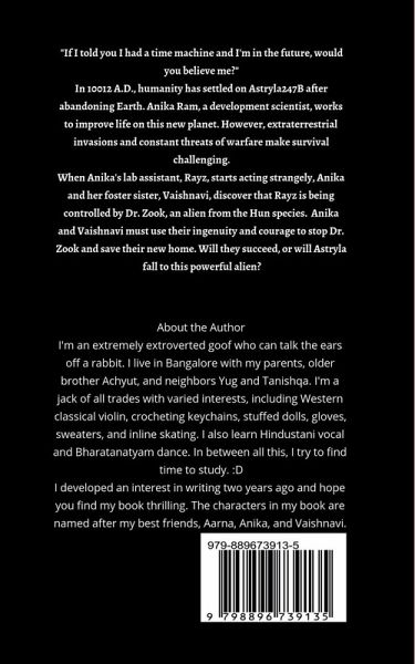 "If I told you I had a time machine and I'm in the future, would you believe me?" In 10014 A.D., humanity has settled on Astryla247B after abandoning Earth. Anika Ram, a development scientist, works to improve life on this new planet. However, extraterrestrial invasions and constant threats of warfare make survival challenging. When Anika's lab assistant, Rayz, starts acting strangely, Anika and her foster sister, Vaishnavi, discover that Rayz is being controlled by Dr. Zook, an alien from the Hun species. Anika and Vaishnavi must use their ingenuity and courage to stop Dr. Zook and save their new home. Will they succeed, or will Astryla fall to this powerful alien?
