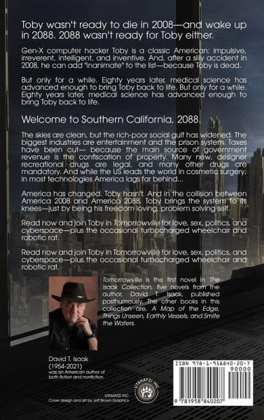 Toby wasn't ready to die in 2008-and wake up in 2088. 2088 wasn't ready for Toby either. Gen-X computer hacker Toby is a classic American: impulsive, irreverent, intelligent, and inventive. And, after a silly accident in 2008, he can add "inanimate" to the list-because Toby is dead. But only for a while. Eighty years later, medical science has advanced enough to bring Toby back to life. Welcome to Southern California, 2088. The skies are clean, but the rich-poor social gulf has widened. The biggest industries are entertainment and the prison system. Taxes have been cut - because the main source of government revenue is the confiscation of property. Many new, designer recreational drugs are legal, and many other drugs are mandatory. And while the US leads the world in cosmetic surgery, in most technologies America lags far behind... America has changed. Toby hasn't. And in the collision between America 2008 and America 2088, Toby brings the system to its knees-just by being his freedom loving, problem solving self. Read now and join Toby in Tomorrowville for love, sex, politics, and cyberspace-plus the occasional turbocharged wheelchair and robotic rat.
