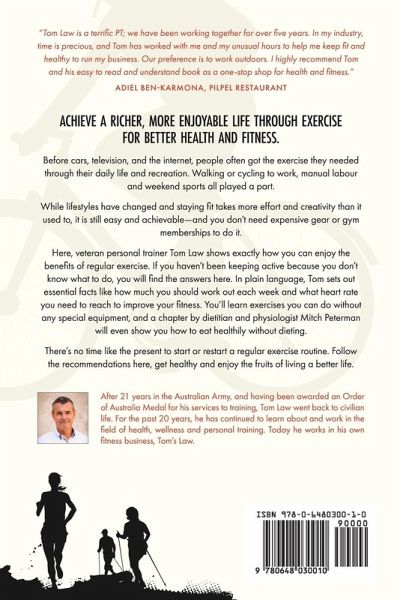 Achieve a richer, more enjoyable life through exercise for better health and fitness. Before cars, television, and the internet, people often got the exercise they needed through their daily life and recreation. Walking or cycling to work, manual labour and weekend sports all played a part. While lifestyles have changed and staying fit takes more effort and creativity than it used to, it is still easy and achievable-and you don't need expensive gear or gym memberships to do it. Here, veteran personal trainer Tom Law shows exactly how you can enjoy the benefits of regular exercise. If you haven't been keeping active because you don't know what exercises to do, how many or for how long, you will find the answers here. In plain language, Tom sets out essential facts like how much you should work out each week and what heart rate you should reach to improve your fitness. You'll learn exercises you can do without any special equipment, and a chapter by dietitian and physiologist Mitch Peterman will even show you how to eat healthily without dieting. There's no time like the present to start or restart a regular exercise routine. Follow the recommendations here, get healthy and enjoy the fruits of living a better life.