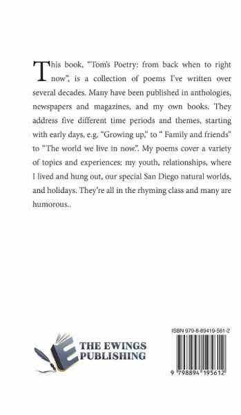 This book, "Tom's Poetry: from back when to right now", is a collection of poems I've written over several decades. Many have been published in anthologies, newspapers and magazines, and my own books. They address five different time periods and themes, starting with early days, e.g. "Growing up," to " Family and friends" to "The world we live in now.". My poems cover a variety of topics and experiences: my youth, relationships, where I lived and hung out, our special San Diego natural worlds, and holidays. They're all in the rhyming class and many are humorous..
