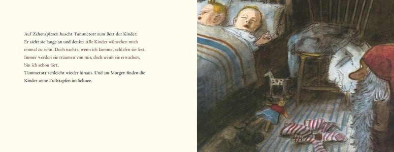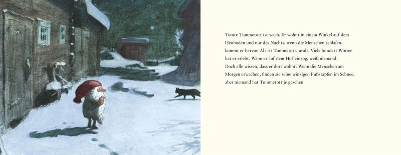 Wenn die Sterne am Himmel funkeln und der Schnee weiß leuchtet, schleicht auf leisen Sohlen Tomte Tummetott, der Wichtel mit der roten Mütze, im Mondlicht umher und hinterlässt winzige Fußstapfen. Er bewacht die schlafenden Menschen und die Tiere auf dem Hof und erzählt ihnen vom Frühling, der bald kommen wird...