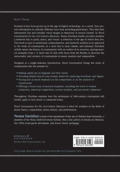 Written in a style that is clear, simple, and informal writing style, Davidian artfully mixes the history of counterpoint with an outline of its structure, placing musical examples from J. S. Bach side by side with those from The Beatles to illustrate the universality and currency of counterpoint in music analysis and composition.