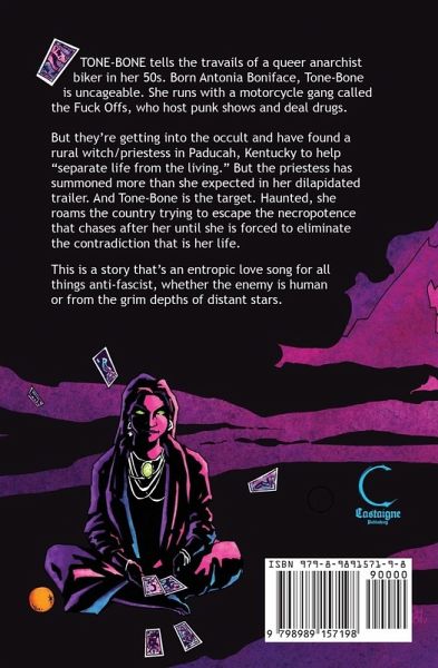 TONE-BONE tells the travails of a queer anarchist biker in her 50s. Born Antonia Boniface, Tone-Bone is uncageable. She runs with a motorcycle gang called the Fuck Offs, who host punk shows and deal drugs. They're getting into the occult and have found a rural witch/priestess in Paducah, Kentucky to help "separate life from the living." But the priestess has summoned more than she expected in her dilapidated trailer. And Tone-Bone is the target. Haunted, she roams the country trying to escape the necropotence that chases after her until she is forced to eliminate the contradiction that is her life. This is a story that's an entropic love song for all things anti-fascist, whether the enemy is human or from the grim depths of distant stars.