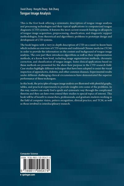 1. Introduction to Tongue Image Analysis.- 2. Tongue Images Acquisition System Design.- 3. Tongue Image Segmentation by Bi-Elliptical Deformable Contour.- 4. A Snake-Based Approach to Automated Tongue Image Segmentation.- 5. Tongue Segmentation in Hyperspectral Images.- 6. Tongue Segmentation by Gradient Vector Flow and Region Merging.- 7. Tongue Segmentation by Fusing Region-based and Edge-based Approaches.- 8. Tongue Shape Classification by Geometric Features.- 9. Color Correction Scheme for Tongue Images.- 10. Tongue Color Checker for Precise Correction.- 11. Tongue Color Analysis for Medical Application.- 12. Statistical Analysis of Tongue Color and Its Applications in Diagnosis.- 13. Hyperspetral Tongue Image Classification.- 14. Computerized Tongue Diagnosis based on Bayesian Networks.- 15. Tongue Image Analysis for Appendicitis Diagnosis.- 16. Diagnosis Using Quantitative Tongue Feature Classification.- 17. Detecting Diabetes Mellitus and Non-Proliferative Diabetic Retinopathy Using CTD Introduction.- 18. Book Review and Future Word.