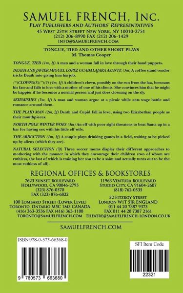 Plays include: Tongue, Tied (1m, 1f) A man and a woman fall in love through their hand puppets. Death and Javier Miguel Lopez Guadalajara Asante (3m) A coffee stand vendor tricks Death into giving him his job. Clowns(s) (4m, 1f) A children's clown, possibly on the run from the law, bemoans his fate and falls in love with a mother of one of his clients. She convinces him that he might be happier if he becomes a normal person and just does clowning on the sly. Skirmishes (3m, 3f) A man and wom