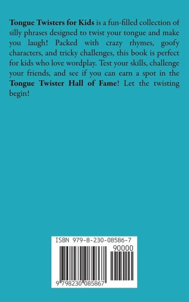 Tongue Twisters for Kids is a fun-filled collection of silly phrases designed to twist your tongue and make you laugh! Packed with crazy rhymes, goofy characters, and tricky challenges, this book is perfect for kids who love wordplay. Test your skills, challenge your friends, and see if you can earn a spot in the Tongue Twister Hall of Fame! Let the twisting begin!