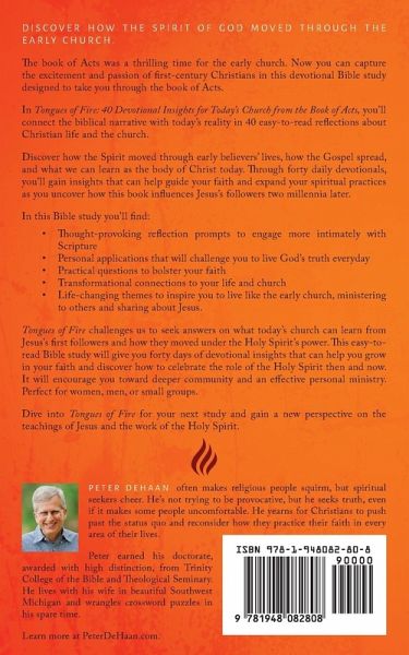 Discover how the Spirit of God moved through the early church, empowering Christians to have a personal, vibrant relationship with Jesus. The book of Acts was a thrilling time for the early church. Now you can capture the excitement and passion of the first-century Christians in this devotional Bible study designed to take you through the book of Acts. In Tongues of Fire: 40 Devotional Insights for Today's Church from the Book of Acts, you'll connect the biblical narrative with today's reality in 40 easy-to-read reflections about Christian life and church. Discover how the Spirit moved through early believers' lives, how the Gospel spread, and what we can learn as the body of Christ today. Through forty daily devotionals, you'll gain insights that can help guide your faith and expand your spiritual practices as you uncover how this book influences Jesus's followers two millennia later. In this Bible study you'll find: Thought-provoking reflection prompts to engage more intimately with Scripture Personal applications that will challenge you to live God's truth everyday Practical questions to bolster your faith Transformational connections to your life and church Life-changing themes to inspire you to live like the early church, ministering to others and sharing about Jesus. Tongues of Fire challenges us to seek answers on what today's church can learn from Jesus's first followers and how they moved under the Holy Spirit's power. This easy-to-read Bible study will give you forty days of devotional insights that can help you grow in your faith and discover how to celebrate the role of the Holy Spirit then and now. It will encourage you toward deeper community and an effective personal ministry. Perfect for women, men, or small groups. Dive into Tongues of Fire for your next study and gain a new perspective on the teachings of Jesus and the work of the Holy Spirit. Get your copy today. [This book has been republished as Acts Bible Study.]