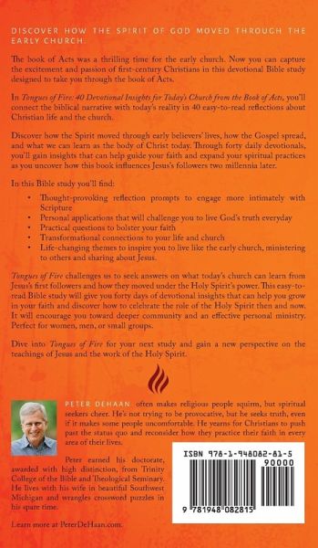 Discover how the Spirit of God moved through the early church, empowering Christians to have a personal, vibrant relationship with Jesus. The book of Acts was a thrilling time for the early church. Now you can capture the excitement and passion of the first-century Christians in this devotional Bible study designed to take you through the book of Acts. In Tongues of Fire: 40 Devotional Insights for Today's Church from the Book of Acts, you'll connect the biblical narrative with today's reality in 40 easy-to-read reflections about Christian life and church. Discover how the Spirit moved through early believers' lives, how the Gospel spread, and what we can learn as the body of Christ today. Through forty daily devotionals, you'll gain insights that can help guide your faith and expand your spiritual practices as you uncover how this book influences Jesus's followers two millennia later. In this Bible study you'll find: Thought-provoking reflection prompts to engage more intimately with Scripture Personal applications that will challenge you to live God's truth everyday Practical questions to bolster your faith Transformational connections to your life and church Life-changing themes to inspire you to live like the early church, ministering to others and sharing about Jesus. Tongues of Fire challenges us to seek answers on what today's church can learn from Jesus's first followers and how they moved under the Holy Spirit's power. This easy-to-read Bible study will give you forty days of devotional insights that can help you grow in your faith and discover how to celebrate the role of the Holy Spirit then and now. It will encourage you toward deeper community and an effective personal ministry. Perfect for women, men, or small groups. Dive into Tongues of Fire for your next study and gain a new perspective on the teachings of Jesus and the work of the Holy Spirit. Get your copy today. [This book has been republished as Acts Bible Study.]