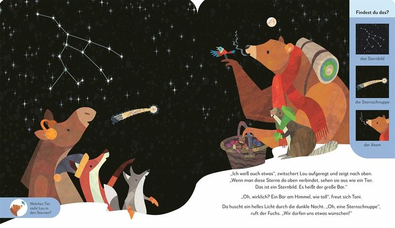 Toni, Lou und ihre Freunde machen einen Spaziergang durch den nächtlichen Winterwald. Sie lernen nachtaktive Tiere kennen und lassen sich von magischen Polarlichtern verzaubern. Das wunderschön gestaltete Suchbuch von Jonny Lambert erzählt von einem Ausflug zu den Tieren im Wald. Bär Toni und seine Vogelfreundin Lou vermitteln Kindern ab 3 Jahren erstes Wissen über die Tiere im Winter. Über 50 Suchbilder laden zum Entdecken ein und schulen spielerisch Aufmerksamkeit und Konzentration. Gucklöcher auf jeder Seite sorgen für zusätzlichen Spielspaß. Das kostenlose Hörbuch, das ganz einfach heruntergeladen werden kann, trainiert Sprachgefühl und Textverständnis. Das fröhliche Vorlesebuch ist ein tolles Geschenk für 3-Jährige und eignet sich auch hervorragend als Gute-Nacht-Geschichte.