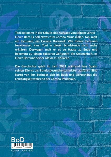 Toni bekommt in der Schule eine Aufgabe von seinem Lehrer Herrn Bert. Er soll etwas zum Corona-Virus malen. Toni malt ein Karussell, ein Corona-Karussell. Wie dieses Karussell funktioniert, kann Toni in dieser Schulstunde nicht mehr erklären. Deswegen malt er es zu Hause zu Ende und bekommt zu einem späteren Zeitpunkt die Gelegenheit, es Herrn Bert und seiner Klasse zu erklären. Die Geschichte spielt im Jahr 2021 während Jens Spahn seinen Dienst als Bundesgesundheitsminister ausführt. Eine Karte von ihm befinden sich im Buch und wertschätzt die Lehrtätigkeit während der Corona-Pandemie.