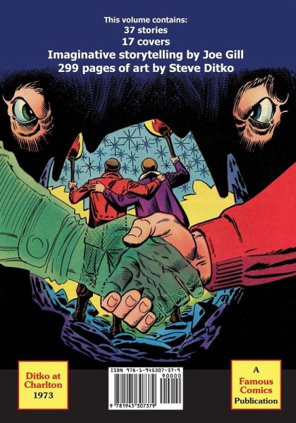 The 1973 edition of Famous Comics' "Ditko at Charlton" series contains 37 stories; 17 covers; in all, 299 pages of Ditko art. Included are two of Ditko's own personal favorites, "Escape" and "Partners." The first-published Killjoy story is represented twice: First, in its original form; then, as revised by Ditko. Stories from E-Man, Ghostly Haunts, Ghostly Tales, Haunted, Haunted Love, The Many Ghosts of Doctor Graves, and Visit Ghost Manor.