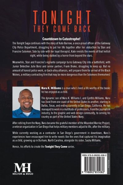 The Tonight Saga continues with the story of Kate Barrow, a once-proud officer of the Gateway City Police Department, struggling to put her life together after her abduction by Stan and Francine Solomon. Side by side with her loyal therapist, Kate revisits the events of that hellish night, while being stalked by a horror from beyond the stars. Meanwhile, Stan and Francine's vigilante campaign turns Gateway City into a battlefield, with Junior Detective Julie Benz and senior partner, Frank Drake, struggling to keep up. But no amount of honest police work, or back-alley alliances, will prepare them for arrival of the Black Wolves, a military contracting firm that may be more dangerous than the Solomons themselves!
