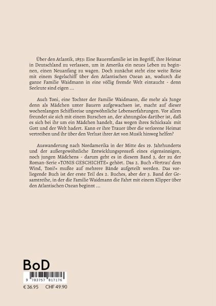 Über den Atlantik, 1853: Eine Bauernfamilie ist im Begriff, ihre Heimat in Deutschland zu verlassen, um in Amerika ein neues Leben zu beginnen, einen Neuanfang zu wagen. Doch zunächst steht eine weite Reise mit einem Segelschiff über den Atlantischen Ozean an, wodurch die ganze Familie in eine völlig fremde Welt eintaucht - denn Seeleute sind eigen ...Auch Toni, eine Tochter der Familie Waidmann, die mehr als Junge denn als Mädchen unter Bauern aufgewachsen ist, macht auf dieser wochenlangen Schiffsreise ungewöhnliche Lebenserfahrungen. Vor allem freundet sie sich mit einem Burschen an, der ahnungslos darüber ist, daß es sich bei ihr um ein Mädchen handelt, das wegen ihres Schicksals mit Gott und der Welt hadert. Kann er ihre Trauer über die verlorene Heimat vertreiben und ihr über den Verlust ihrer Art von Musik hinweg helfen?Auswanderung nach Amerika in der Mitte des 19. Jahrhunderts und der Entwicklungsprozeß eines eigensinnigen Mädchens - darum geht es in diesem Band 3, der zu der Roman-Serie »TONIS GESCHICHTE« gehört. Das 2. Buch »Vertrau' dem Wind, Toni!« mußte auf mehrere Bände aufgeteilt werden. Das vorliegende Buch ist der erste Teil des 2. Buches, aber der 3. Band der Gesamtreihe, in der die Familie Waidmann die Fahrt mit einem Klipper über den Atlantischen Ozean beginnt ...