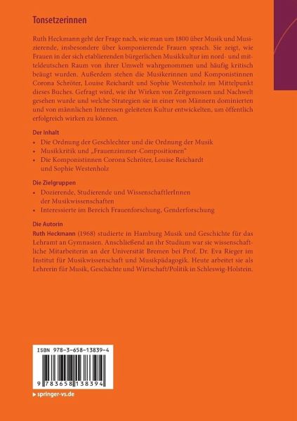 Ruth Heckmann geht der Frage nach, wie man um 1800 über Musik und Musizierende, insbesondere über komponierende Frauen sprach. Sie zeigt, wie Frauen in der sich etablierenden bürgerlichen Musikkultur im nord- und mitteldeutschen Raum von ihrer Umwelt wahrgenommen und häufig kritisch beäugt wurden. Außerdem stehen die Musikerinnen und Komponistinnen Corona Schröter, Louise Reichardt und Sophie Westenholz im Mittelpunkt dieses Buches. Gefragt wird, wie ihr Wirken von Zeitgenossen und Nachwelt gesehen wurde und welche Strategien sie in einer von Männern dominierten und von männlichen Interessen geleiteten Kultur entwickelten, um öffentlich erfolgreich wirken zu können.