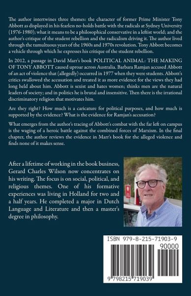 AUSTRALIAN POLITICAL HISTORY. The author intertwines three themes: the character of former Prime Minister Tony Abbott as displayed in his fearless no-holds battle with the far-left radicals at Sydney University (1976-1980); what it means to be a philosophical conservative in a leftist world; and the author's critique of the student rebellion and the radicalism driving it. The author lived through the tumultuous years of the 1960s and 1970s revolution. Tony Abbott becomes a vehicle through which he expresses his scathing critique of the student rebellion. In 2012, a passage in David Marr's book POLITICAL ANIMAL: THE MAKING OF TONY ABBOTT caused uproar across Australia. Leftist Marr is an out-and-proud passionate critic of Abbott's. Barbara Ramjan, wife of a top-gun criminal lawyer and hitherto unknown to the public, accused Abbott of subjecting her to an act of violence that (allegedly) occurred in 1977 when they were students at Sydney University. Marr made Ramjan's accusation public thirty-five years later. Abbott's many critics in politics and the media swallowed the accusation and treated the alleged violence as more evidence for the views they had long held about him. The scenario they propagate is that Abbott is sexist and hates women; claims men are the natural leaders of society; and in politics he is brutal and insensitive. Above all this, is the irrational discriminatory religion that motivates him. Abbott has no place in politics. Indeed, feminist Susan Mitchell strove to make the case in her book TONY ABBOTT; A MAN'S MAN that Abbott was 'dangerous'. But how well do the many books and reports attacking Abbott stand up to scrutiny? How well does their judgment of Abbott bear close investigation? How much is a caricature for political purposes, and how much is supported by the evidence? What is the evidence for Ramjan's accusation? In TONY ABBOTT AND THE TIMES OF REVOLUTION, the author investigates. He traces Abbott's political development from school through to the end of his time at Sydney University (1963-1980). A contemporary of Abbott's and sharing a similar background, the author draws on his experiences and reactions to the tumultuous times of the 1960s and 1970s in addition to the documentary research. The book is in four parts: the school years and the 1960s revolution; student radicalism at Sydney University 1973-1975, the prelude to Abbott's arrival on campus; Abbott's engagement with the far left (1976-1980); and the media and Abbott. What emerges from the author's tracing of Abbott's combat with the far left on campus is the waging of a heroic battle on behalf of Western Civilisation against the combined forces of Marxism in its multiple manifestations. In the final chapter, the author reviews the evidence in Marr's book for the alleged violence and finds none of it makes sense. There are holes through which a herd of African elephants could pass without touching the sides. The book contains an index of names.