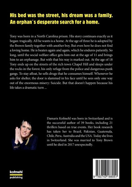 His bed was the street, his dream was a family. An orphan´s desperate search for a home.Tony was born in a North Carolina prison. His story continues exactly as it began: tragically. All he wants is a home. At the age of three he is adopted by the Brown family together with another boy. But even here he does not find a loving home. He is beaten again and again, which he endures patiently. So long, until the social welfare office gets him out at the age of 11 and brings him to an orphanage. But with that his way is marked out. At the age of 18 Tony ends up on the streets of the rich town Chapel Hill and sleeps under the rocks in the forest, his only refuge from the police and dangerous punk gangs. To stay afloat, he sells drugs that he consumes himself. Whenever he asks for shelter, the door is slammed in his face until he sees only one way out of the enormous misery: Suicide. But that doesn't happen because his life takes a dramatic turn ...