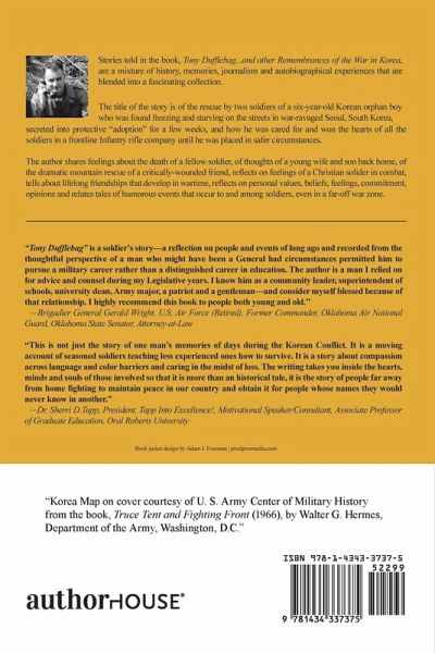 Stories told in the book, "Tony Dufflebag . . . and other Remembrances of the War in Korea," are a mixture of memories, history, journalism and autobiographical experiences that are blended into a fascinating collection. The title story is of the rescue by two soldiers of a six-year-old Korean orphan boy who was found freezing and starving on the streets in war-ravaged Seoul, South Korea, then secreted into protective "adoption" for a few weeks, and how he was cared for and won the hearts of all the soldiers in a frontline Infantry rifle company until he was placed in safer circumstances. The author shares feelings about the death of a fellow soldier, of thoughts about a young wife and son back home, of the dramatic mountain rescue of a critically-wounded friend, reflects on feelings of a Christian soldier in combat, tells about lifelong friendships that develop in wartime, reflects on personal values, beliefs, feelings, commitments, opinions and relates tales of humorous events that occur to and among soldiers, even in a far-off war zone.