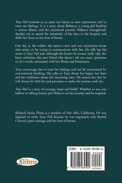 Tony Pail reminds us to open our hearts to new experiences and to trust our feelings. It is a story about Rebecca, a young girl battling a serious illness, and her emotional journey. Rebecca courageously decides not to spend the remainder of her days in the hospital and shifts her focus to her love of horses. One day at the stables, she meets a new and very mysterious horse that seems to be trying to communicate with her. He tells her his name is Tony Pail, and although she knows he cannot really talk, her heart welcomes this new friend who doesn't ask too many questions or isn't overly concerned with her illness and limitations. Tony encourages her to trust her feelings and not be constrained by conventional thinking. She talks to Tony about her hopes, her fears and her confusion about her remaining days. He assures her that he will always be with her and promises to make the journey with her. Tony Pail is a story of courage, hope and belief. Whether or not you believe in talking horses, join Rebecca on her journey and be inspired.